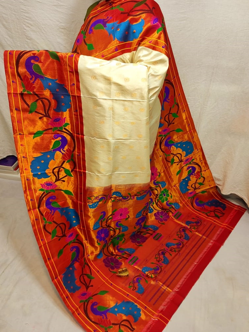 Shree Renuka Mata PrasannaBig Border Broket Paithani.Handmade SareePure Silk MaterialFancy PalluAll Over ButtaSelf Blouse.Soft WearSilk mark sertifiedPreorder...